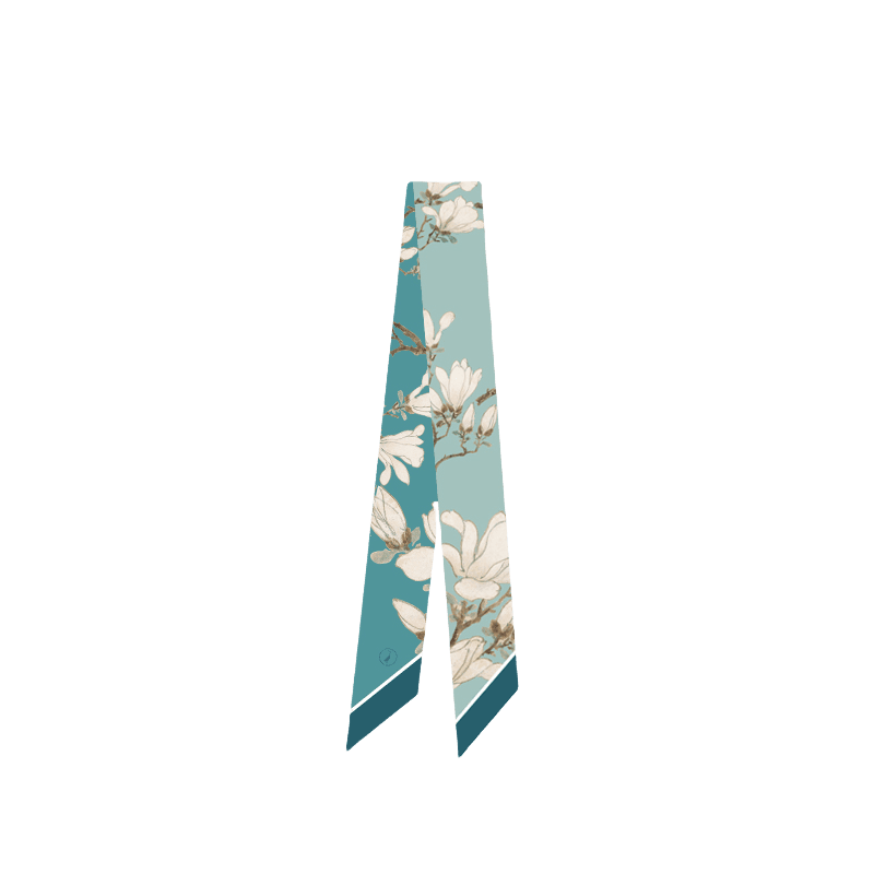 Crafted from luxurious silk, this accessory exudes timeless charm and sophistication. Inspired by the purity and beauty of the white magnolia flower, each scarf captures the essence of grace and femininity. Elevate any ensemble with this exquisite piece, adding a touch of refinement and style to your look. Whether worn as a necktie, headband, or bracelet, let the White Magnolia Silk Narrow Scarf be your symbol of elegance and grace.